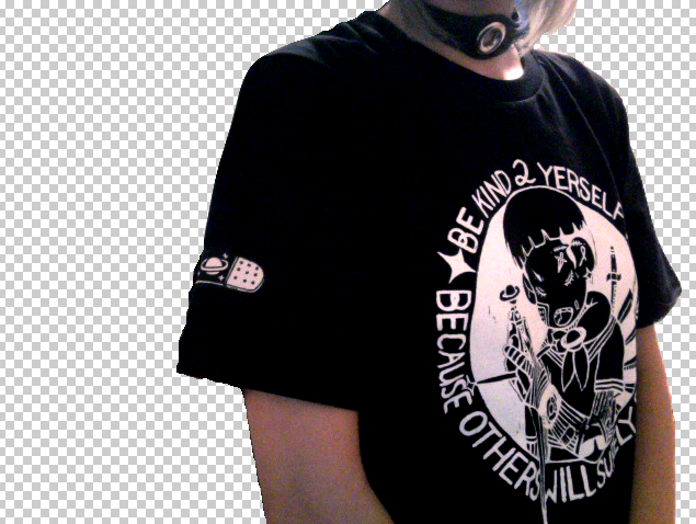 features bandaid patch on the sleeve
